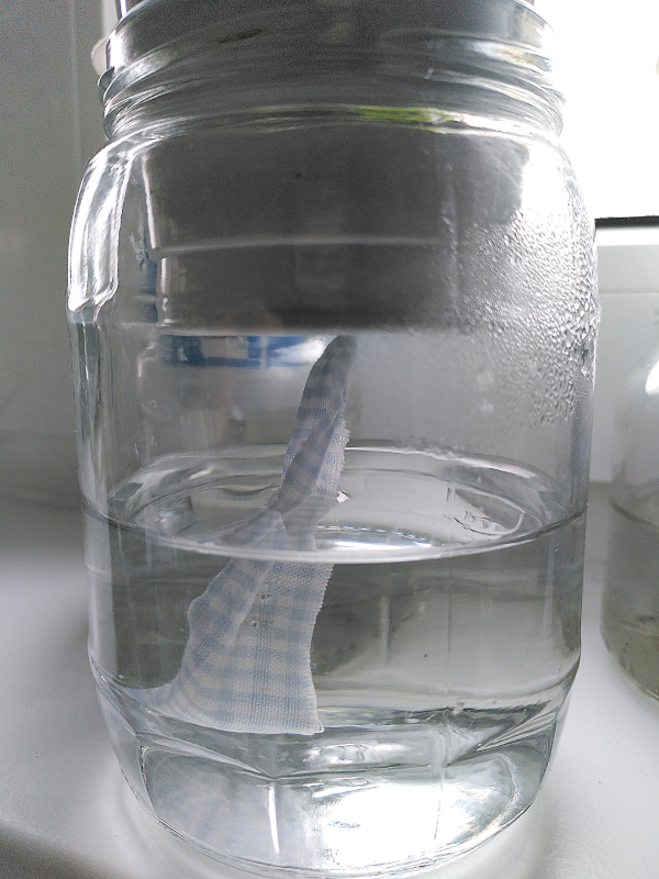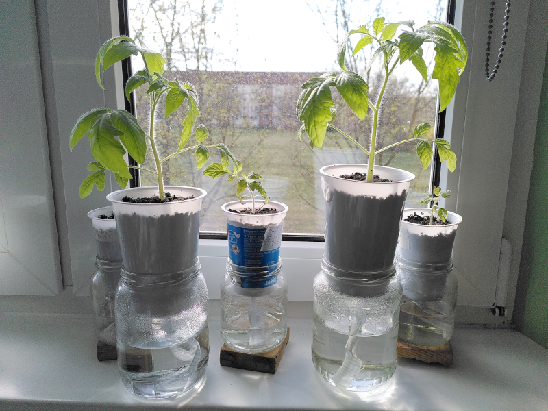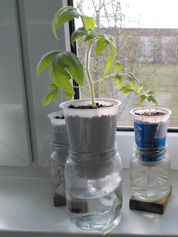 Danach wird der Becher mit Erde oder Anzuchtsubstrat gefüllt, die Jungpflanze eingesetzt und der Becher so in die Glasöffnung gesetzt, dass der Baumwollstreifen als „Docht“ vom Wasser ins Substrat reicht. Über diese Kapillarwirkung zieht sich die Erde kontinuierlich Feuchtigkeit nach oben – die Pflanzen werden gleichmäßig versorgt, ohne dass man ständig gießen muss.