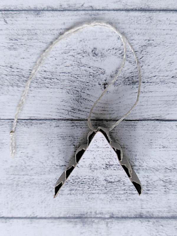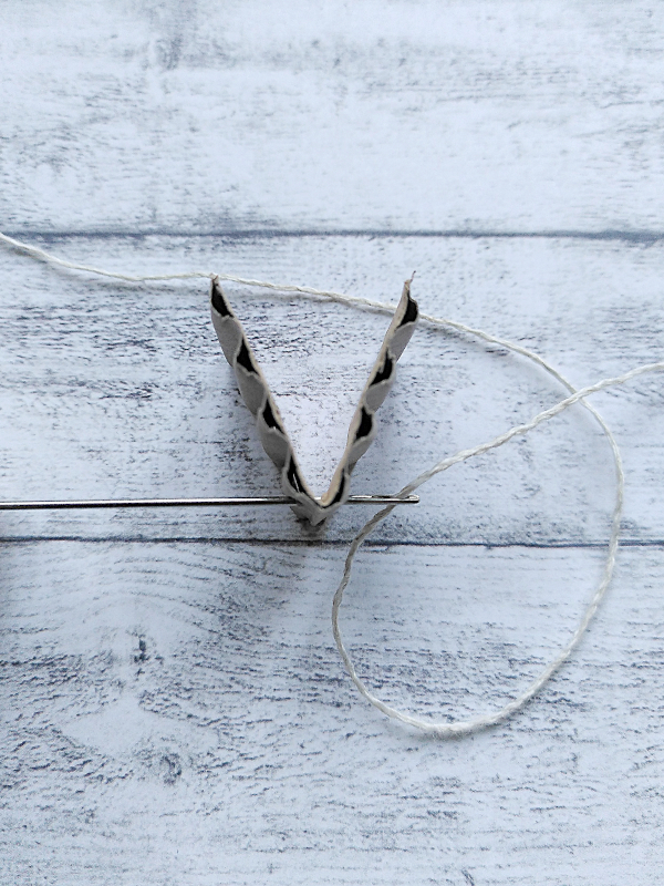 Damit das Häuschen aufgehängt werden kann, kommt ein Faden an die Dachspitze. Dieser läßt sich einfacher mit einer Nähnadel durch ziehen….