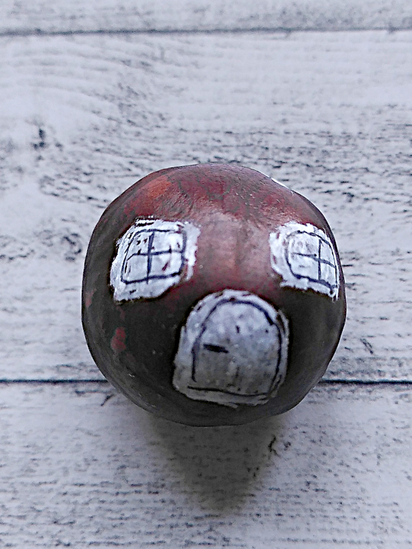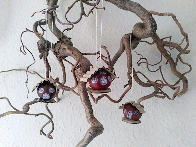 Mehrere unterschiedlich angemalte Kastanienhäuschen zum Beispiel in einen Zweig der Korkenzieher-Haselnuss gehängt, ergeben eine herbstliche und zugleich liebevolle Dekoration.