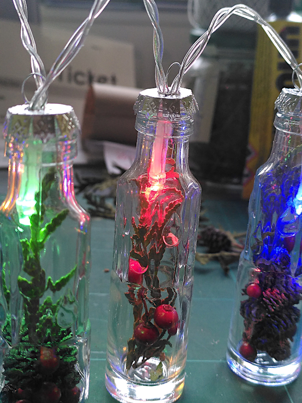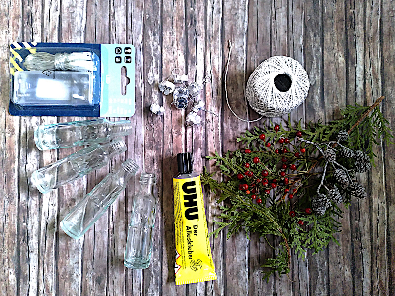 Schnapsfläschchen als Weihnachtsbaumanhänger und Lichterkette upcyceln