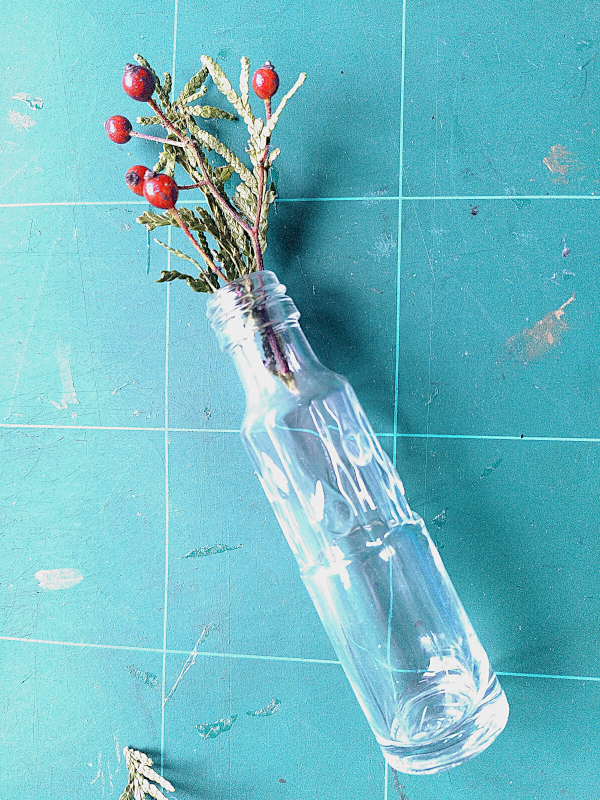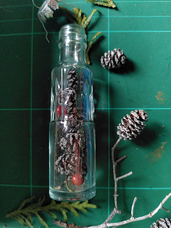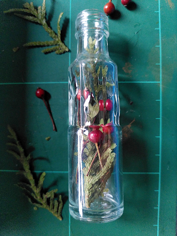 Zerkleinere die Koniferenzweige und Hagebuttenzeige, so dass sie in die Flaschen passen. Löse die Erlenzapfen von den Stielen. Arrangiere Zweige, Hagebutten und Zapfen nach deinem Geschmack und befülle damit die Fläschchen.