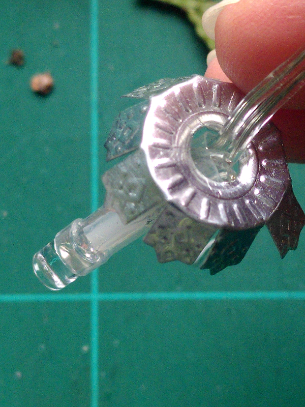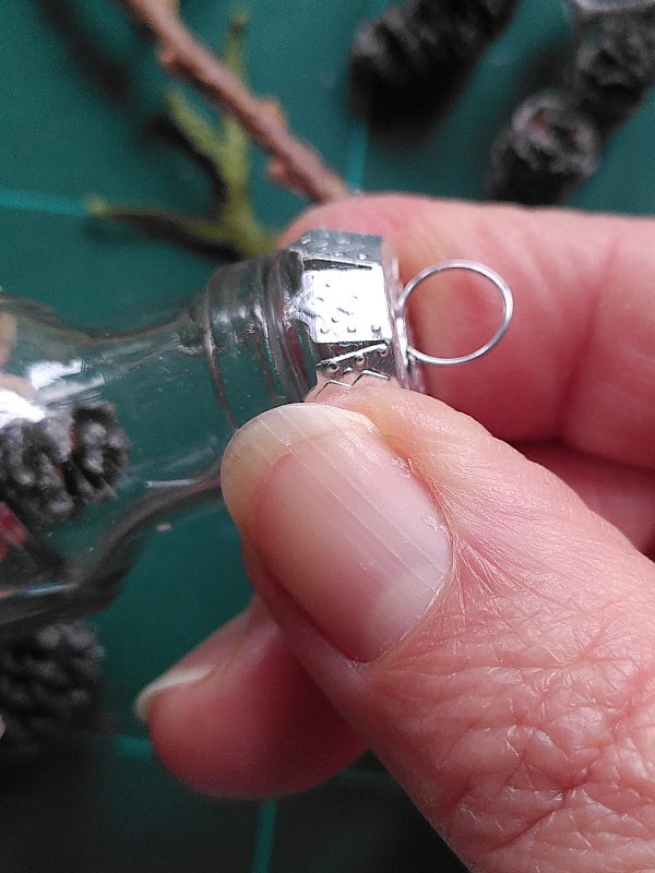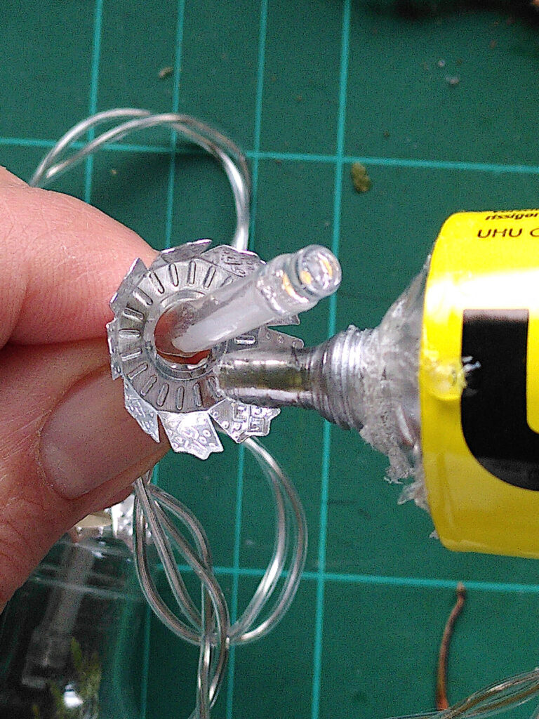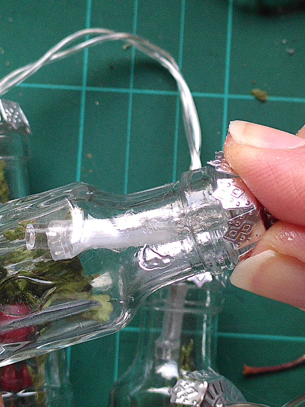 Setze zum Schluß alle Bügelhalterungen wieder in die Kugelkappen ein um die Lichterkette zusätzlich an den Fläschchen zu fixieren.
