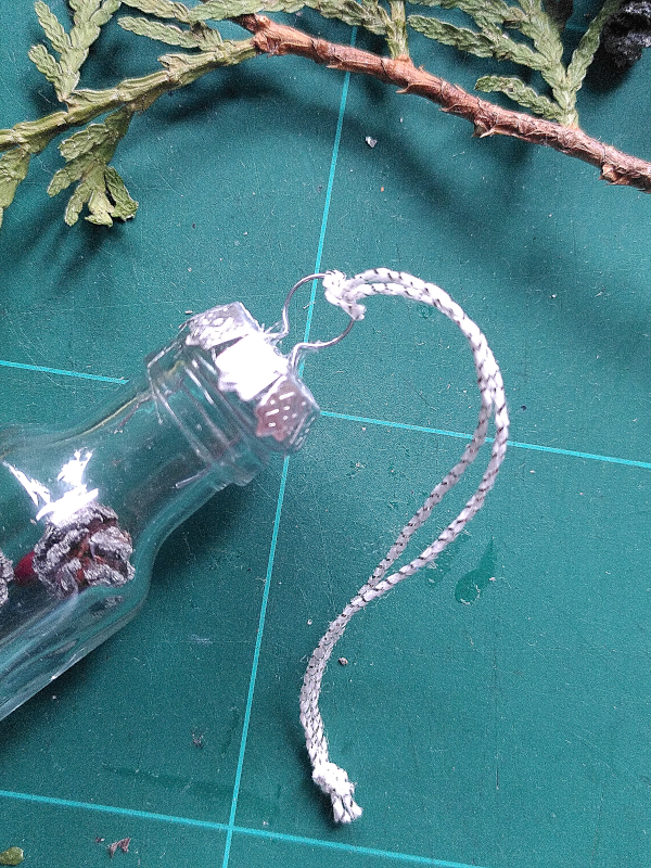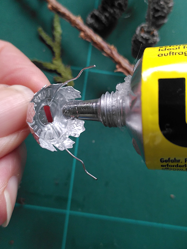 Auch dafür braucht es nicht viel an Zubehör: für die Füllung getrocknete Naturmaterialien wie kleine Hagebutten, Nadelzweige und Erlenzapfen, Weihnachtskugelkappen und