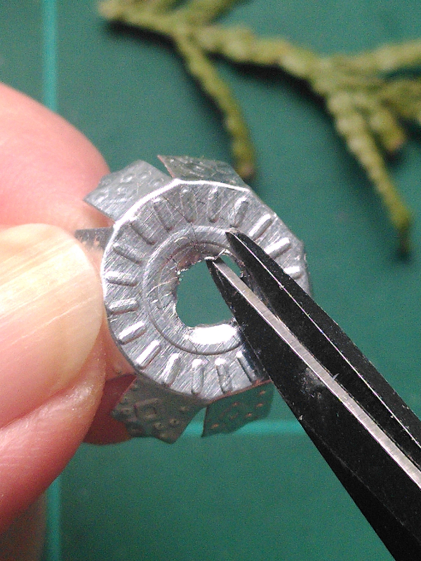 Entferne die Drahtbügel aus der Kugelkappenhalterung und vergrößere das Loch mit einer Drahtschere soweit,