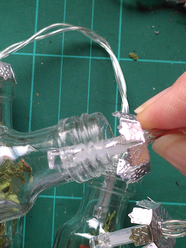 Befestige so alle LED-Segmente der Lichterkette mit den Kugelkappen an den Fläschchen.